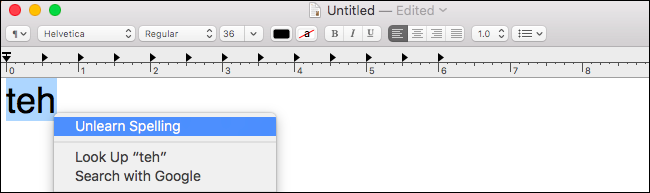 Gépeljük be a hibás szót a TextEdit-be, vagy pedig másoljuk ki és illesszük be egy másik alkalmazásból. Kattintsunk a hibás szóra a Ctrl-click vagy jobb kattintás segítségével. Válasszuk ki az "Unlearn spelling" lehetőséget a hibásan felvett kifejezés eltávolításához a szótárunkból.