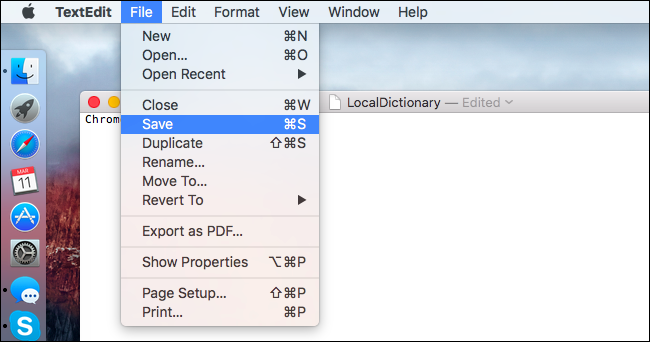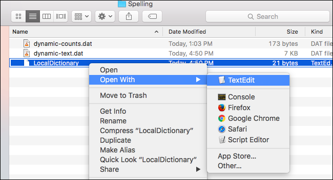 A kiadott parancs a /Felhasználó/Felhasználónév/Library/Spelling könyvtárba vezet bennünket. Itt látni fogunk egy "LocalDictionary" nevű fájlt. Nyissuk meg a TextEdit segítségével a Ctrl-kattintás vagy jobb-kattintással, válasszuk ki az "Open With" lehetőséget és adjuk meg a "TextEdit" alkalmazást.