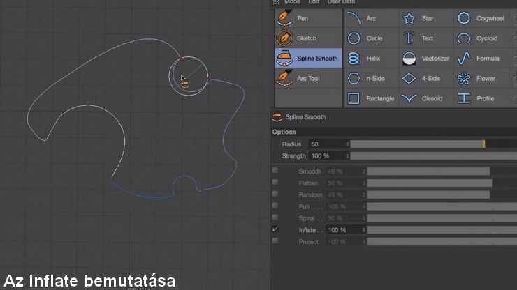 A spline objektumokat általában a bonyolultabb formák gyors megalkotására szoktuk használni, a kibővült spline eszközökkel pedig még gyorsabbá válik a munka. Egyszerűen és gyorsan adhatunk újabb pontokat a spline-hez, vagy törhetjük le a kerekítést. Olyan eszközök kerültek be az R17-be, mint például a smooth, amivel az éles kiugrásokat finomíthatjuk, vagy az inflate, ami a boole objektumhoz hasonlóan alakzatokat von ki a spline-ból, és a pull, amivel egyfajta ecsetként kihúzhatunk alakzatokat az eredeti formából.