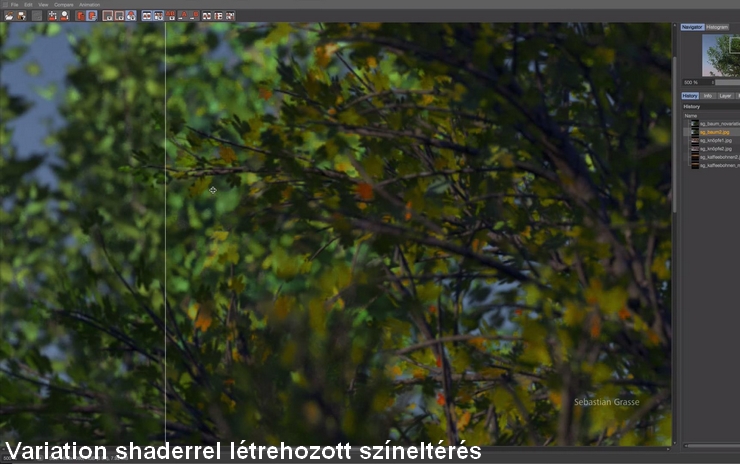 Ha sok azonos objektum van egy jelenetben – például tetőcserepek, téglák, vagy falevelek – azt általában apró színeltérésekkel tesszük élethűvé, hiszen kevésbé valószínű, hogy például egy fán minden levél azonos színű. Míg ezt korábban több materiallal, vagy az UV koordináták variálásával értük el, addig a Variation Shader automatikusan elvégzi a feladatot. Mindössze annyi a dolgunk, hogy megadjuk a színeltérés intervallumát, és a Variation Shader véletlenszerűen létrehozza a színeltéréseket az objektumokon.