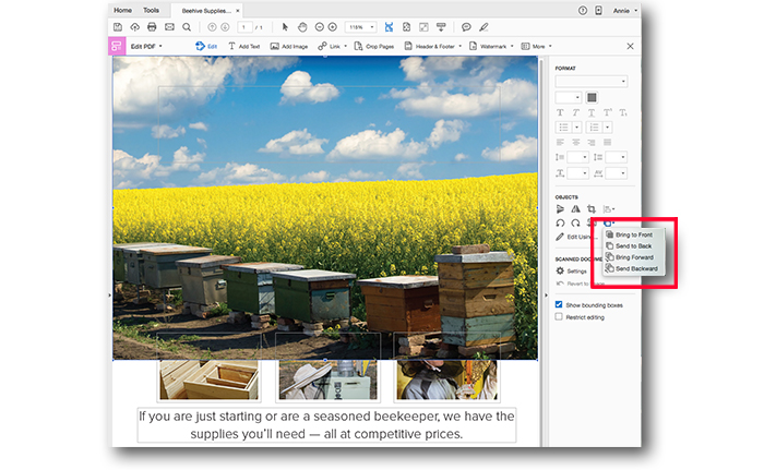 3. A fejléc képünk már a helyén, de ez magában rejt három másik képet is. Válaszd a "Arrange objects" lenyíló ablakot a jobb oldalon lévő mezőben, a grafika felcímkézéséhez. Majd válaszd a "Send to Back" opciót.