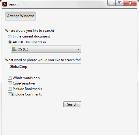 1. Advanced Search- Jelöld meg az Advanced Search segítségével az összes PDF fájlt, amit frissítened kell: Edit > Advanced Search. Ha megnyílik a kereső párbeszéd ablaka, válaszd ki a "All PDF Documents in" opciót és határozd meg a keresés helyét. ( Pl: C meghajtó). Majd üsd be a szót, amit szeretnél megkeresni és véglegesen kicserélni.