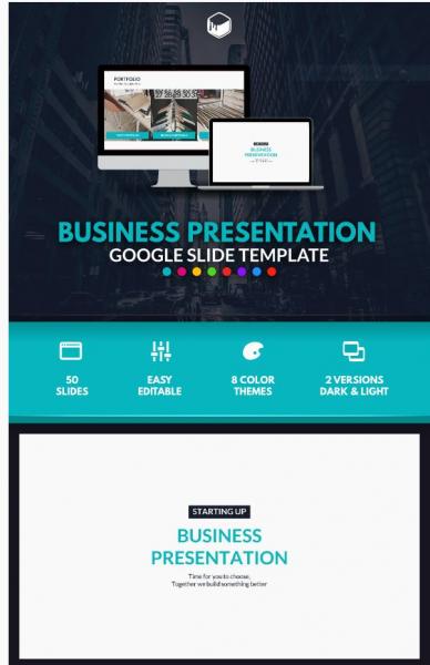 Ez a könnyen áttekinthető, modern, üzleti sablon gyorsan és könnyedén együttműködik a Google Diákkal. Nyolc különböző sötét és világos kinézetű színes téma közül választhatunk. Nagyszerűen használható üzleti és portfólió bemutatóra. Szöveget, alakzatot, diagramot, ikonokat és intelligens elemeket tartalmaz.