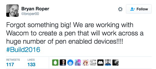Valahogyan ezt az új univerzális tollat elfeljtették megemlíteni a Microsoft Build 2016 konferenciáján, ahol bejelentették a Windows Inket, egy írásra és vázlatkészítésre használható tollat, de a stylus-t később egy rövid twitter üzenet formájában Bryan Roper jelntette be.