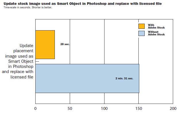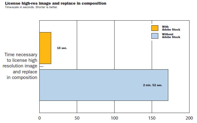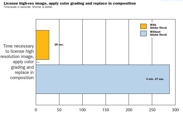 Mivel ezzel a módszerrel a stock fotók különböző forrásokkal használhatók, az Adobe Stock szolgáltatásnak egyértelmű előnye van a CC Libraries-el történő közvetlen integráció miatt. A licenselés és az eredeti kép frissítése az Adobe Stock használatával csupán 28 másodpercet vett igénybe, szemben más stock fotók használatával, ahol ez az időtartam két és fél perc volt.
