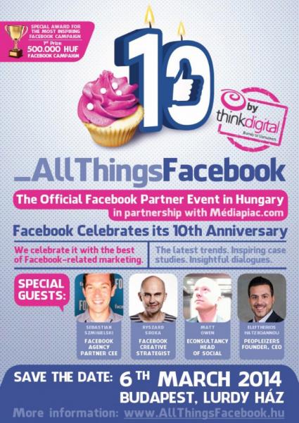 Március 6-án AllThingsFacebook címmel rendez konferenciát a Thinkdigital Hungary és a Médiapiac. Az AllThingsFacebook a közösségi oldal hivatalos, nemzetközi partnereseménye, amely tudásmegosztó platformként kívánja segíteni a márkatulajdonosokat, ügynökségeket és médiatulajdonosokat abban, hogy a Facebook hatékony eszköz legyen a kezükben.