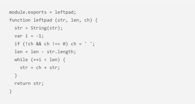 A legtöbb programozó sohasem hallott a left-pad-ról, de most, valamiért a kód nem futott le nélküle. Fontos megérteni, hogy a legtöbb szoftver egy másik szoftverre épül, amelyik szintén egy másik szoftvertől függ. A saját alkalmazás elindításához bizonyos programcsomagokra van szükségünk az npm-től, de azoknak a csomagoknak is további csomagokra van szükségük. A legfontosabb ok, amiért az npm ilyen népszerű lett az a tényező, hogy segít kezelni ezeket a függőségeket, a különböző csomagok egyetlen helyen történő tárolásával.