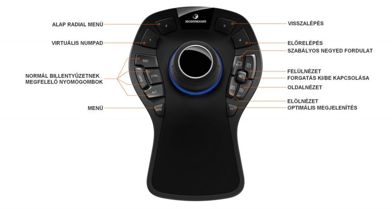 A 3d Connexion SpaceMouse Pro ezen felül rendelkezik 4 különböző gyorsmenüvel is, amelyeket a számozott nyomógombokhoz rendelhetünk, így akár 16 különböző billentyűkombinációt is gyorsan és egyszerűen elérhetünk általa, akár teljesen kiváltva a billentyűzet használatát.