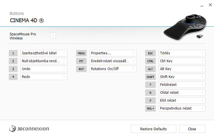 A SpaceMouse Pro nyomógombjainak alap beállítása: